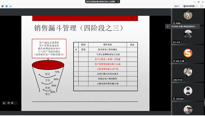 本次培训由浙江办李烨娇结合销售漏斗讲解分析,在讲解的过程中还结合日常工作、公司政策流程、企业文化及客户需求讲解,和各个办事处分享日常工作中的经验和如何更好的服务客户,帮助客户解决需求和问题 。