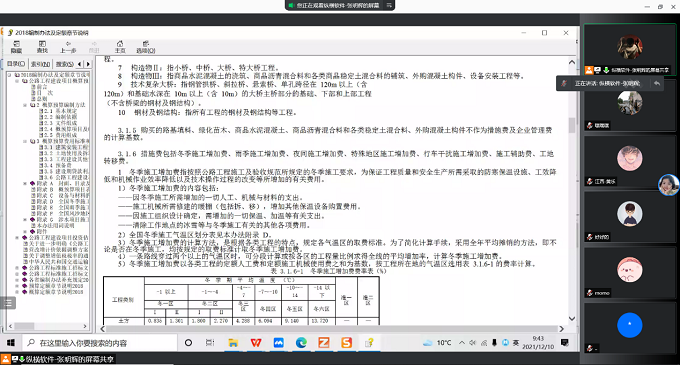 本次网络培训由纵横软件公司江西办张工授课,课程内容结合公路工程建设项目概算预算编制办法、江西省补充规定以及纵横招投标小例题讲解软件,培训方式为腾讯会议线上直播。培训方式的改变提高了对培训质量的要求,遇到了许多困难,但在大家的共同努力下,成功的解决了问题。课程教授过程中,大家积极参与讨论,就平时在软件操作过程中遇到的问题进行提问,营造了良好的学习气氛,顺利完成了本次培训的任务。