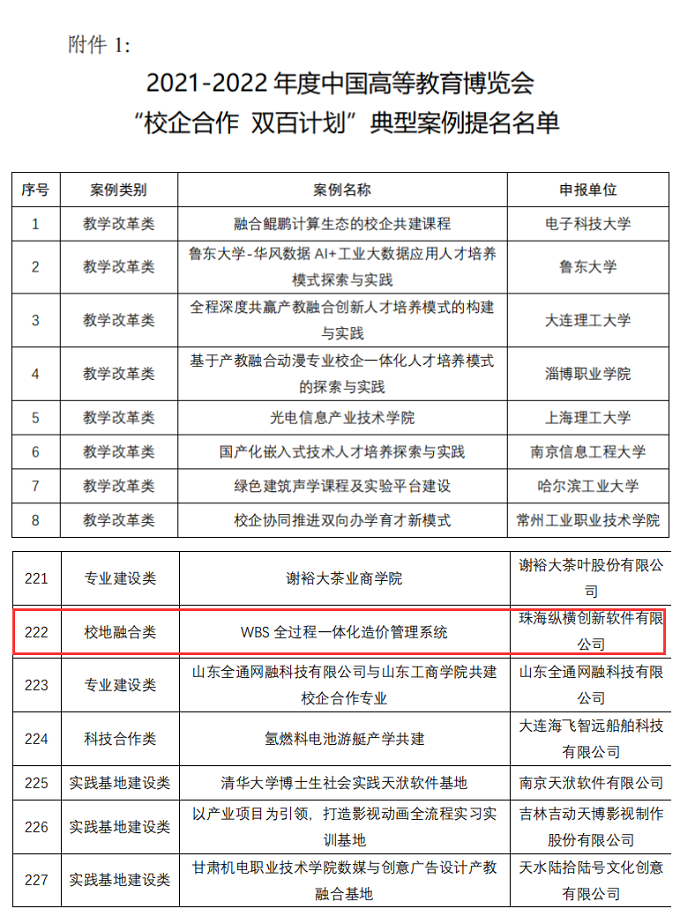 “校企合作 双百计划”典型案例提名名单