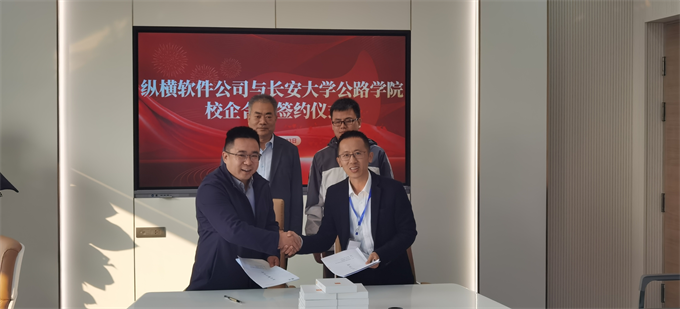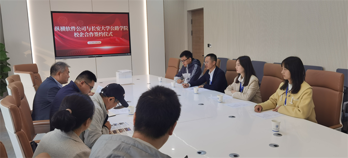 2023年10月23日,长安大学公路学院与纵横创新软件有限公司,在长安大学公路学院会议室举行了校企合作签约仪式。公路学院副院长张久鹏、院系主要老师及纵横软件西北区域总经理苟彦刚、甘肃分公司经理李朋涛一行,出席签约仪式。